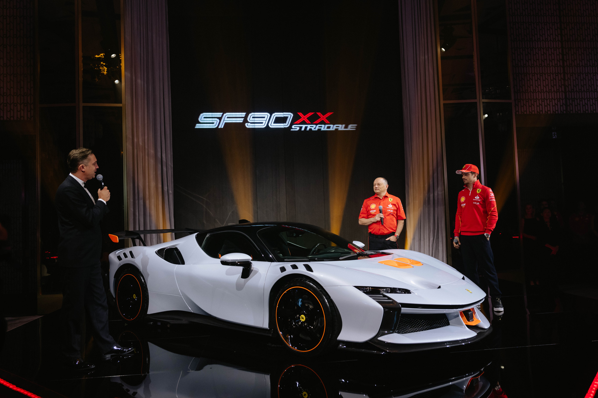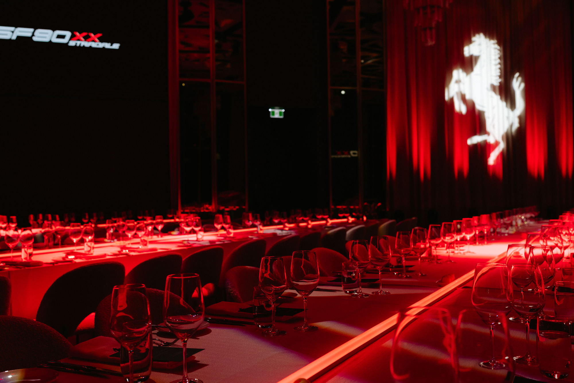 Guests indulged in the lavish caviar bar and champagne pairings, with an option to try a bespoke cocktail with a touch of the iconic Ferrari Cavallino. Transitioning into the ballroom, anticipation built as the doors opened to a dynamic space adorned with futuristic table arrays inspired by Ferrari’s SF90 XX vehicle. LED strips guided the journey to seats, where personalised table settings awaited. The evening came to life as Charles Le Clerc (Ferrari Formula 1 Driver) and Fred Vasseur (Ferrari Team Principal) took the stage to surprise guests by revealing the SF90 XX vehicle, following a live feature moment with a digital drawing of the vehicle. To capture the attention of the audience, a live auction of Ferrari’s most exclusive signed items took place to raise funds for their selected charity on the night.